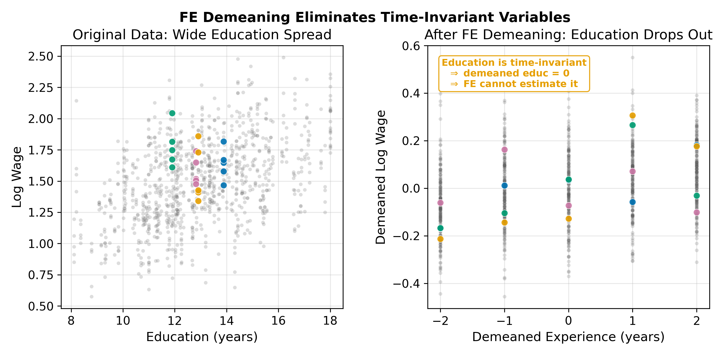 Education and race are gone. Because \(\text{educ}_i = \bar{\text{educ}}_i\) for every period, the demeaned variable \(\text{educ}_i - \bar{\text{educ}}_i = 0\). The same applies to \(\text{black}_i\). Fixed effects eliminates the endogeneity problem by eliminating \(\alpha_i\), but it also eliminates everything that does not vary over time, including the coefficients we care about most.