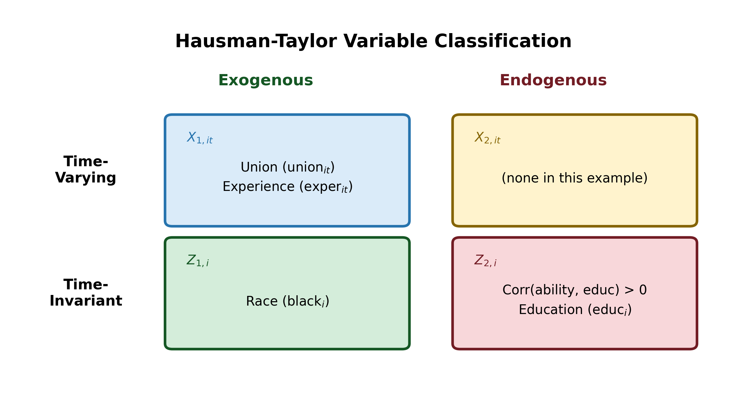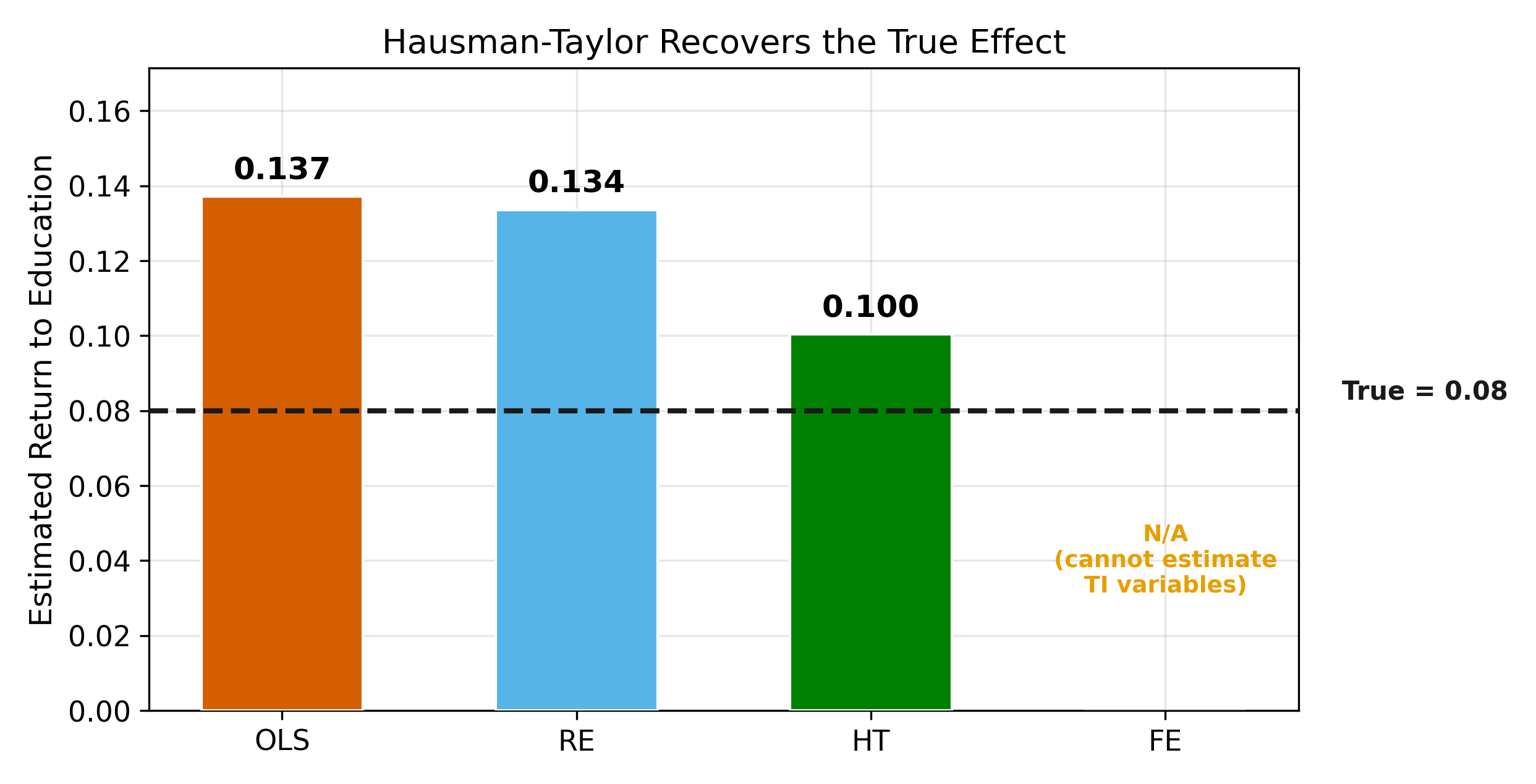 \(\implies\) The estimator is only as good as the variable classification. If you cannot defend why a particular time-varying variable is uncorrelated with \(\alpha_i\), the HT estimates are no more trustworthy than RE.