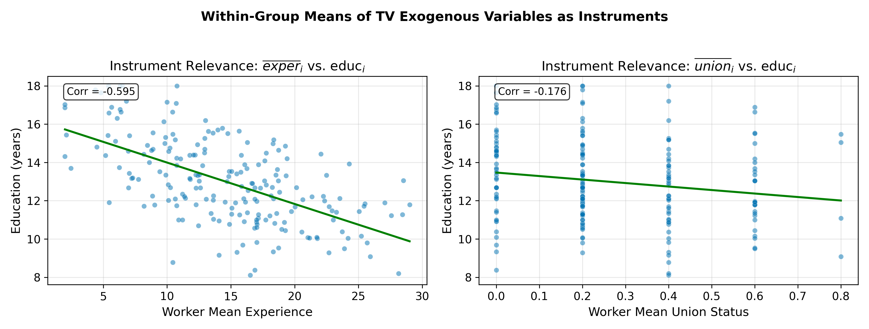 Why does this work? Consider experience as \(X_1\) and education as \(Z_2\). Individual average experience \(\bar{\text{exper}}_i\) varies across individuals and is correlated with education level (more educated workers may enter the labor force later, accumulating a different experience profile). But if experience is exogenous, meaning \(\text{Cov}(\text{exper}_{it}, \alpha_i) = 0\), then \(\bar{\text{exper}}_i\) is also uncorrelated with \(\alpha_i\). We have an instrument that is: