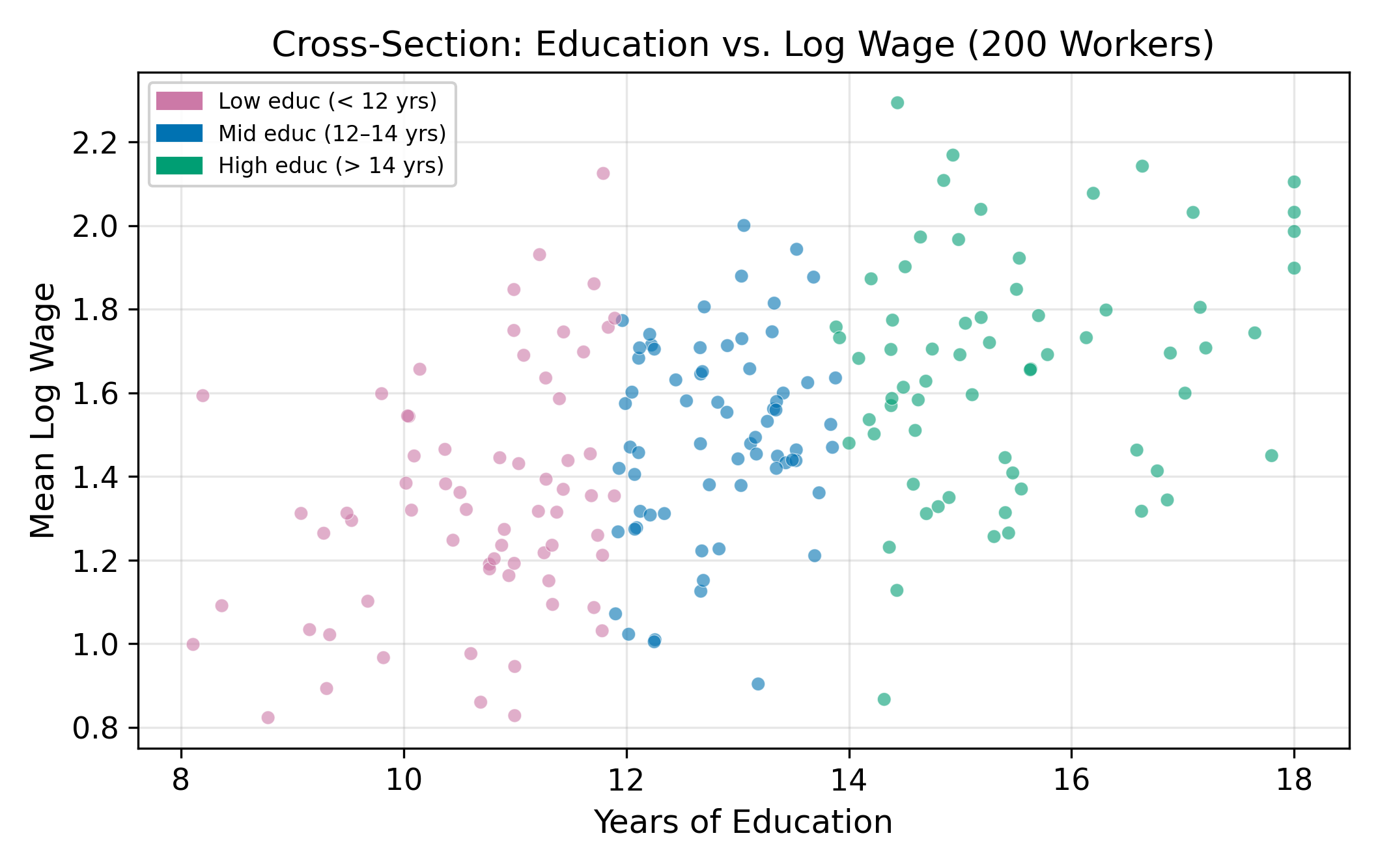 The individual effect \(\alpha_i\) captures unobserved ability, motivation, family connections, and everything else that is specific to person \(i\) but constant over time. The problem is that ability is almost certainly correlated with education: more able individuals tend to acquire more schooling. That means \(\text{Cov}(\alpha_i, \text{educ}_i) \neq 0\), and any estimator that ignores this correlation will produce biased estimates of \(\beta_1\).