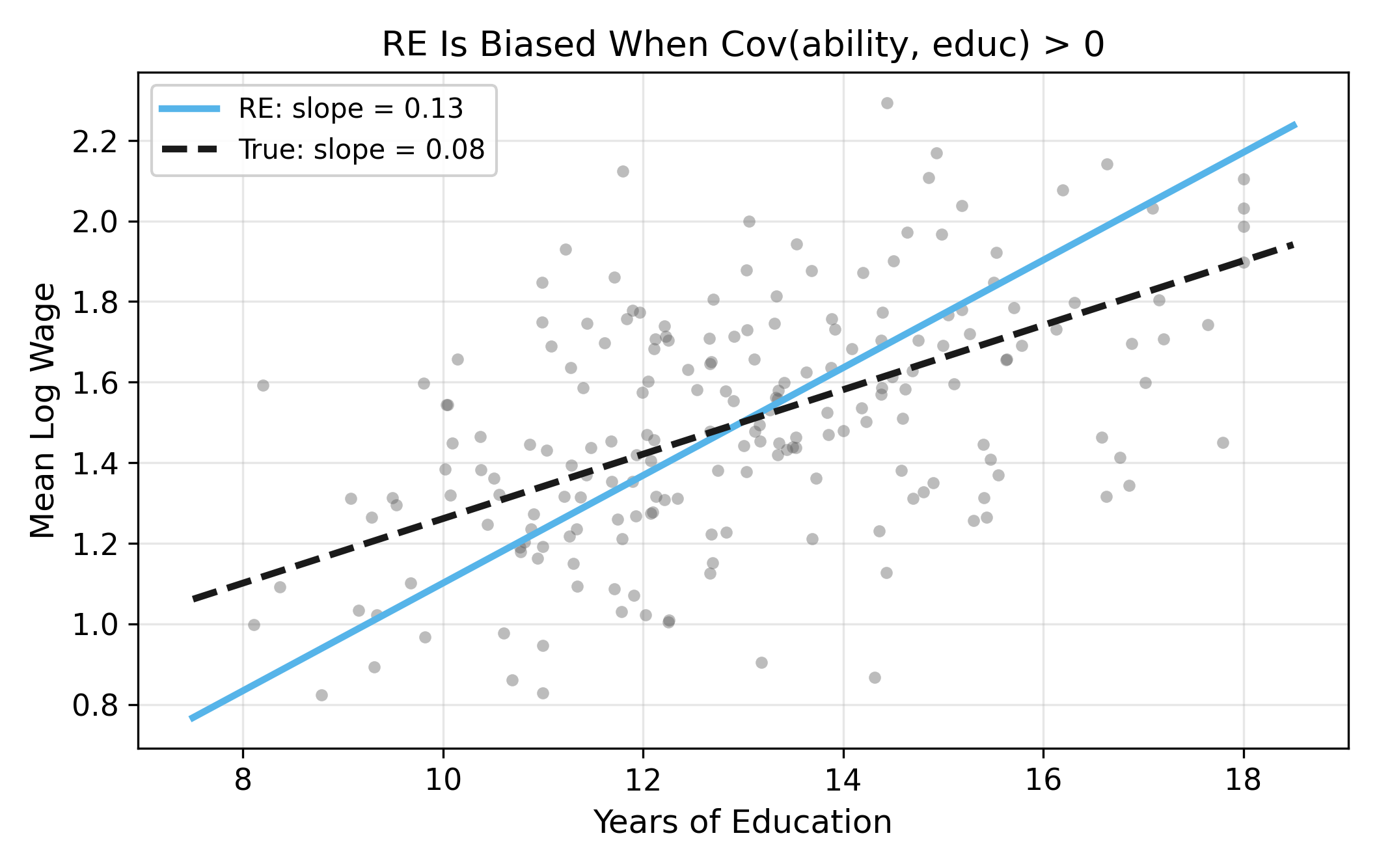 If ability (\(\alpha_i\)) is correlated with education, this assumption fails. RE produces an estimate of \(\beta_1\), but that estimate is biased and inconsistent.