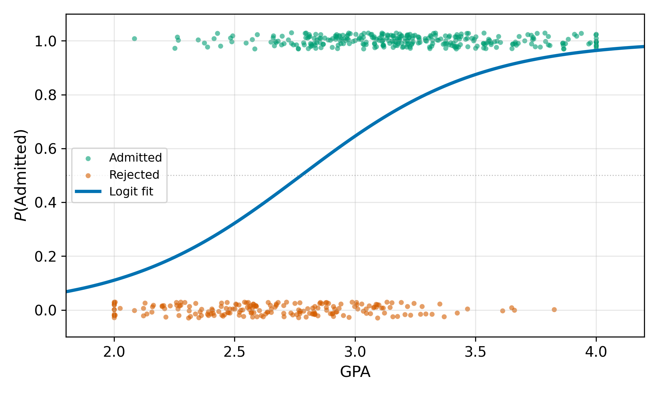 Figure 15.4: Logit fit to the admissions data. The S-curve constrains all predictions to [0, 1] and allows the marginal effect to vary with GPA.