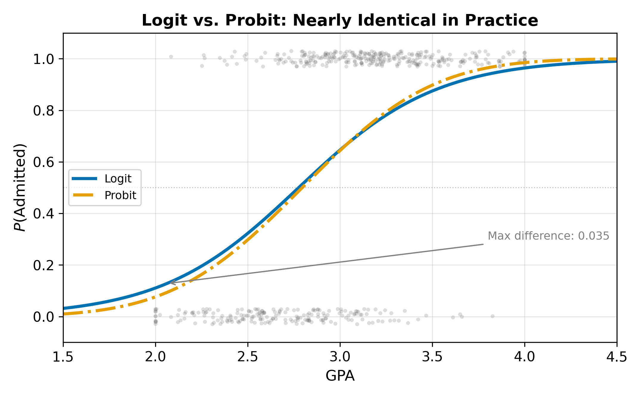 The logit and probit models use different CDFs but produce remarkably similar results in practice. The logistic distribution has slightly heavier tails than the normal, meaning logit assigns slightly more probability to extreme outcomes.