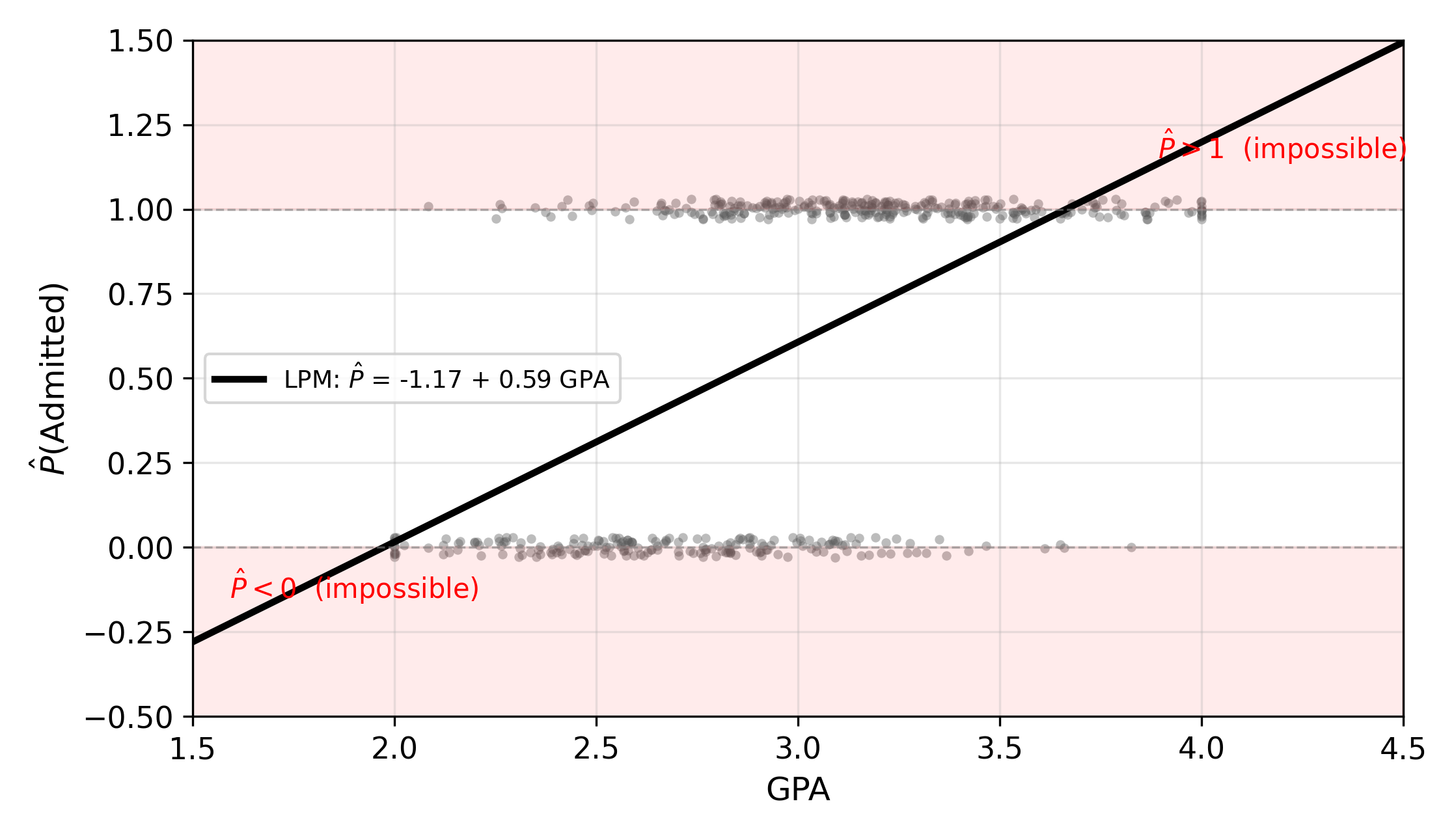 The LPM is easy to estimate and easy to interpret: \(\beta_1\) is the change in the probability of admission for a one-unit increase in GPA. But it has three structural problems.