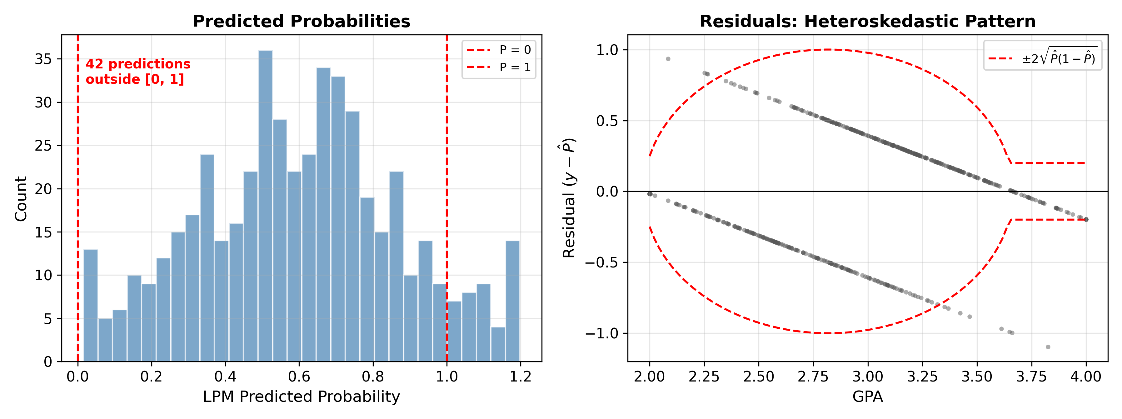 In practice, always report robust (heteroskedasticity-consistent) standard errors when using the LPM. The structural heteroskedasticity from \(\text{Var}(y \mid x) = P(1-P)\) makes conventional OLS standard errors unreliable.