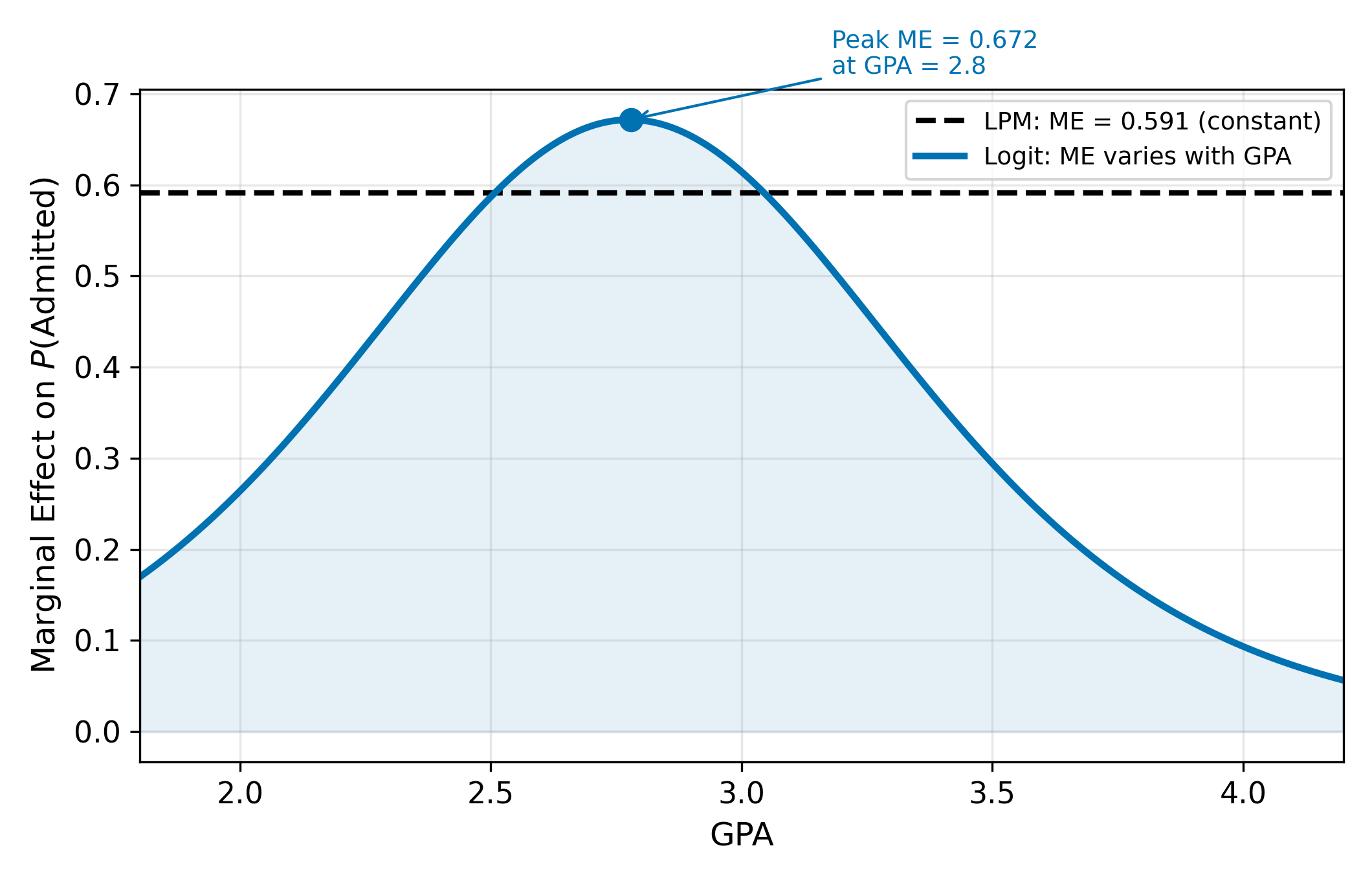 A useful approximation: at the point where \(P = 0.5\), the logit marginal effect is approximately \(\beta_1 / 4\). This “divide by four” rule gives a quick upper bound on the marginal effect without computing \(\Lambda\).