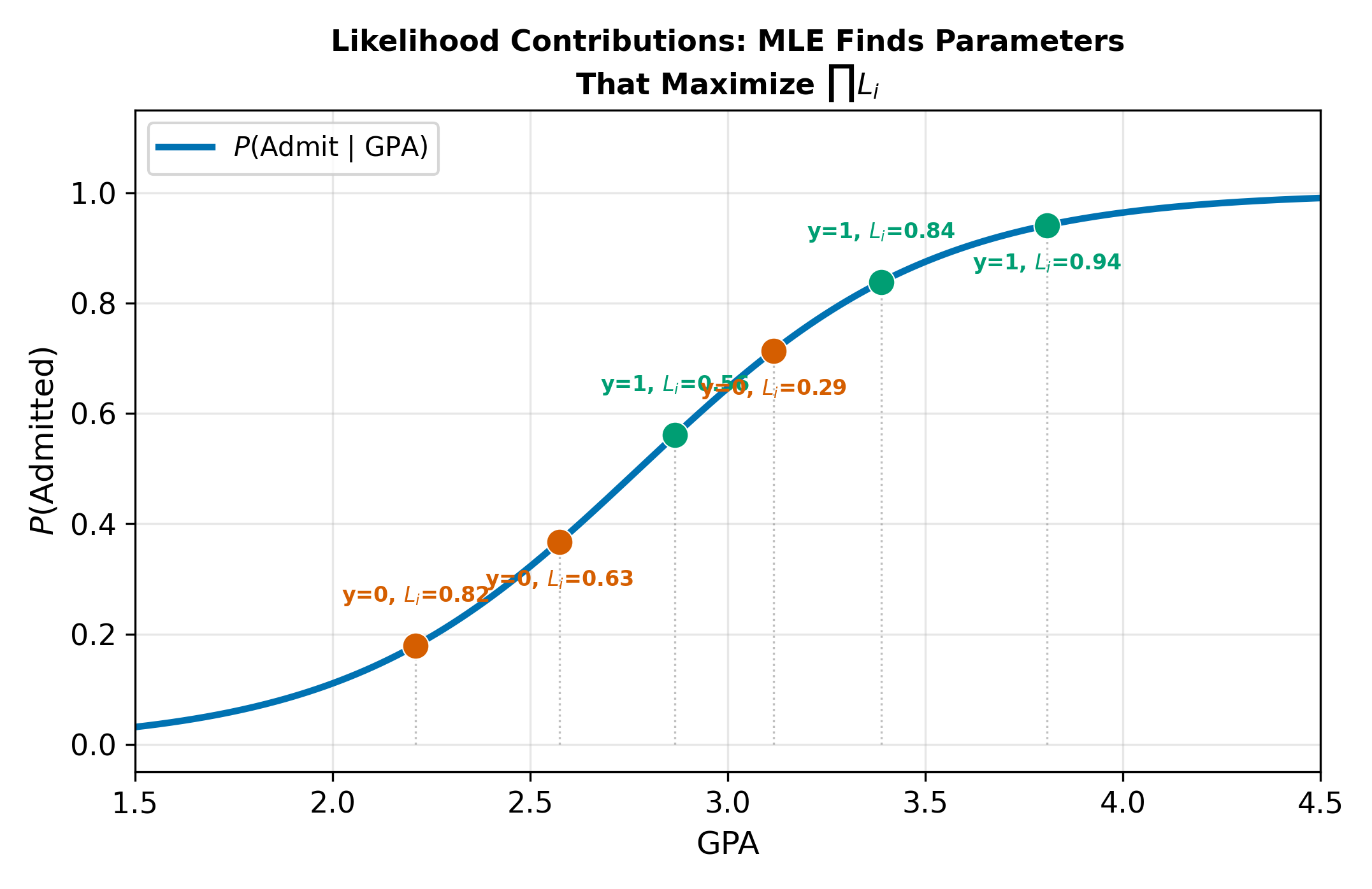 Figure 15.8: MLE intuition: the optimizer searches for parameter values that assign the highest probability to the observed data. Each observation pulls \(\beta\) in the direction that makes its outcome more likely.