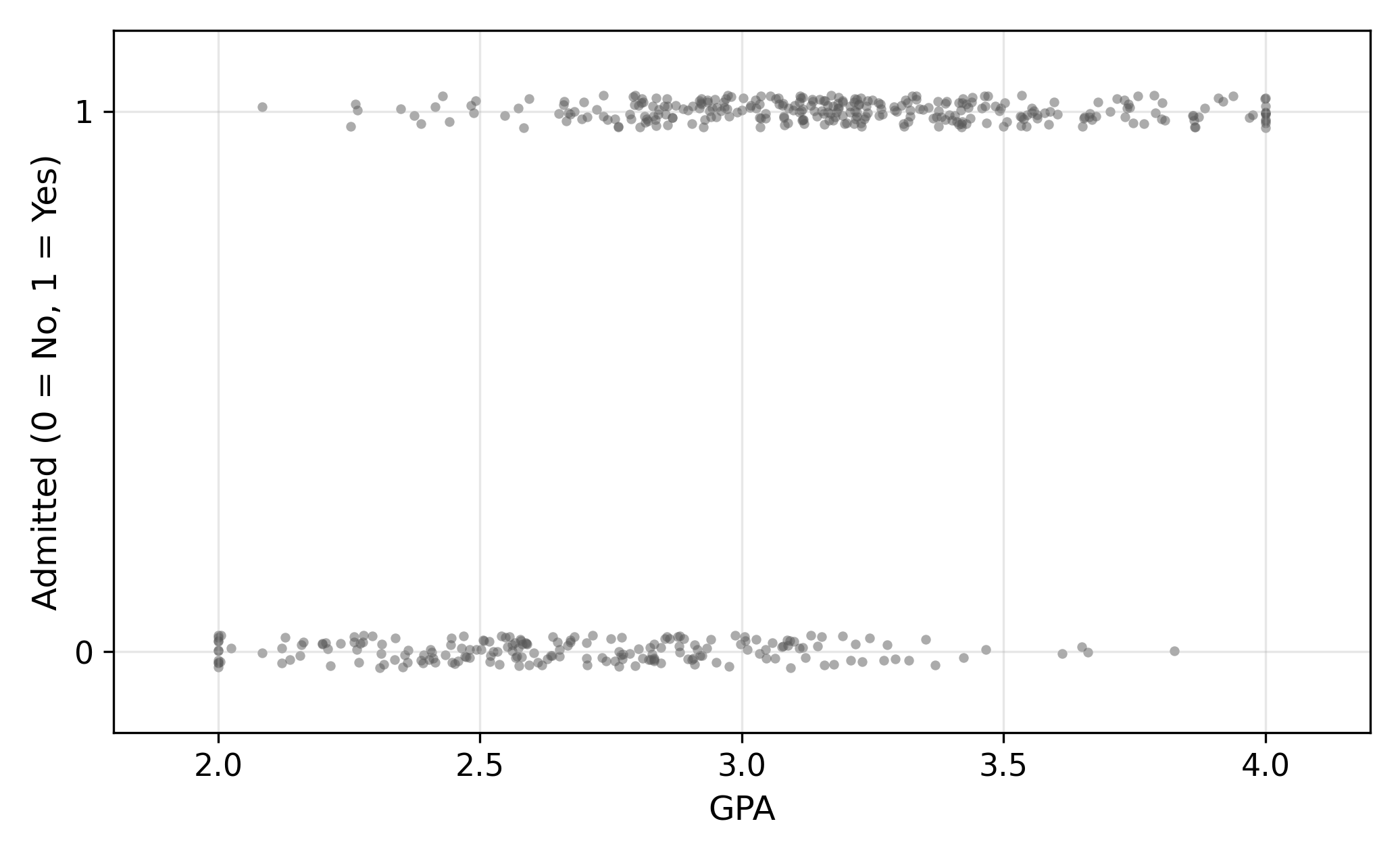Suppose we want to predict whether a student is admitted to a graduate program (\(\text{Admit}_i = 1\)) or rejected (\(\text{Admit}_i = 0\)) based on their undergraduate GPA. The most natural starting point is to just run OLS: