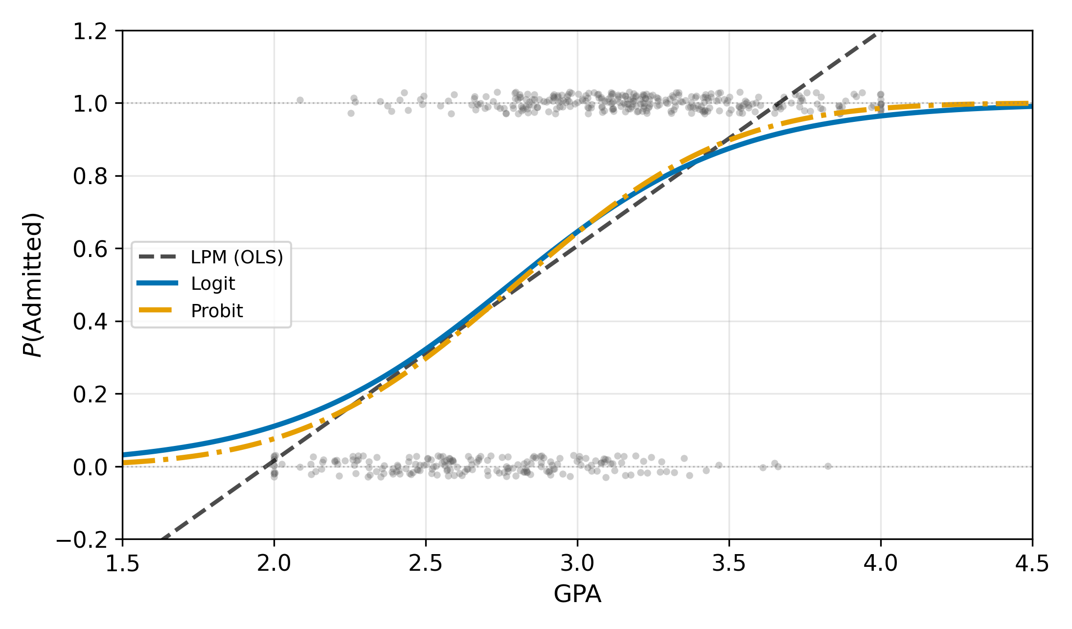 When the outcome is binary (admitted/rejected, employed/unemployed), OLS can produce impossible predictions and biased marginal effects. Logit and probit models constrain predicted probabilities to [0, 1] through an S-shaped link function. This page builds the intuition visually, from the LPM’s failures through the latent variable framework to marginal effects interpretation.