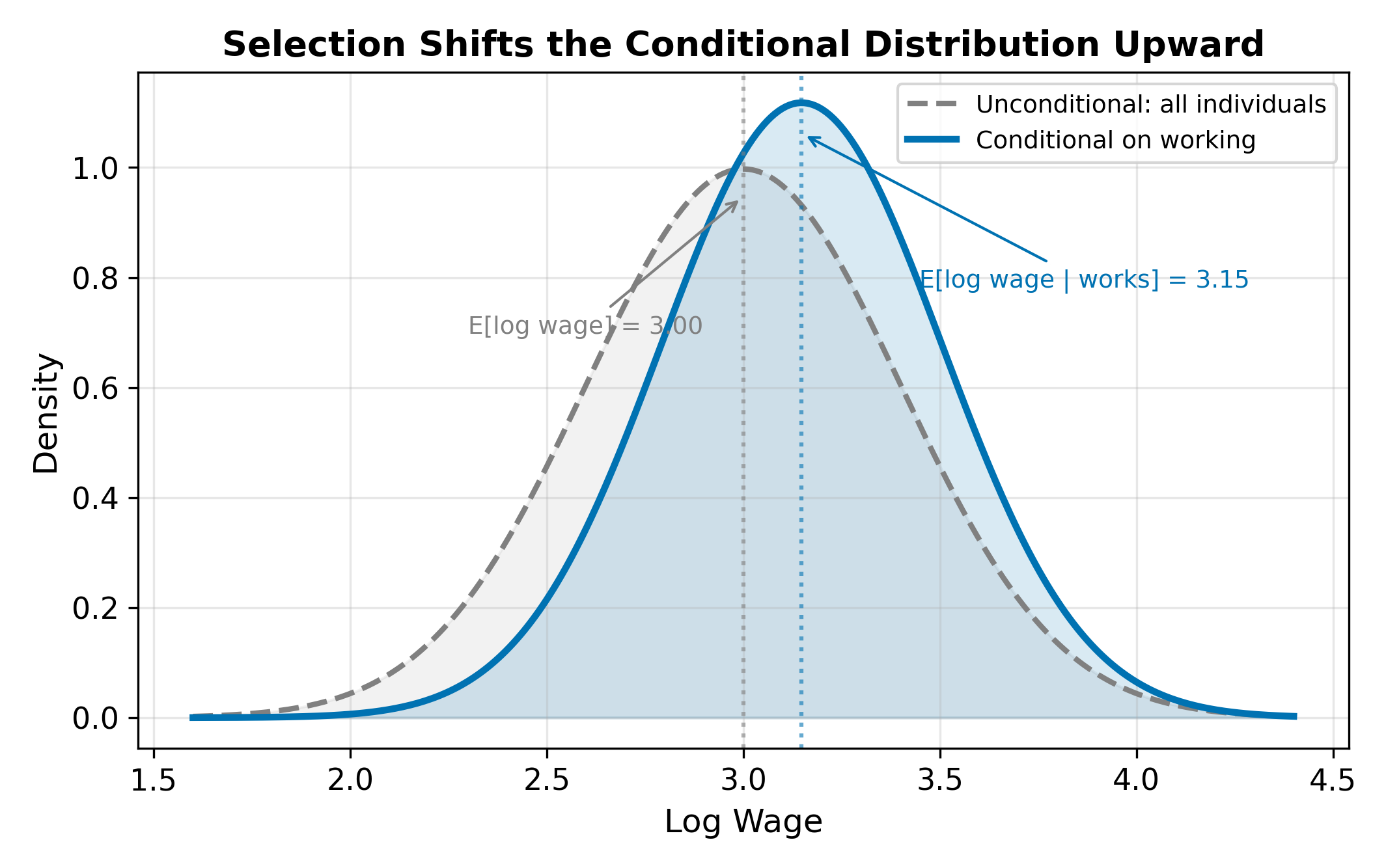 Think of it this way. Suppose you wanted to estimate the average height of all Americans, but your sample consists entirely of NBA players. You would massively overestimate the population mean because your sample is selected on an outcome (basketball ability) that correlates with the variable you are trying to measure (height). OLS on workers only makes the same mistake: it estimates a wage equation from a sample selected on a variable (the decision to work) that correlates with wages themselves.