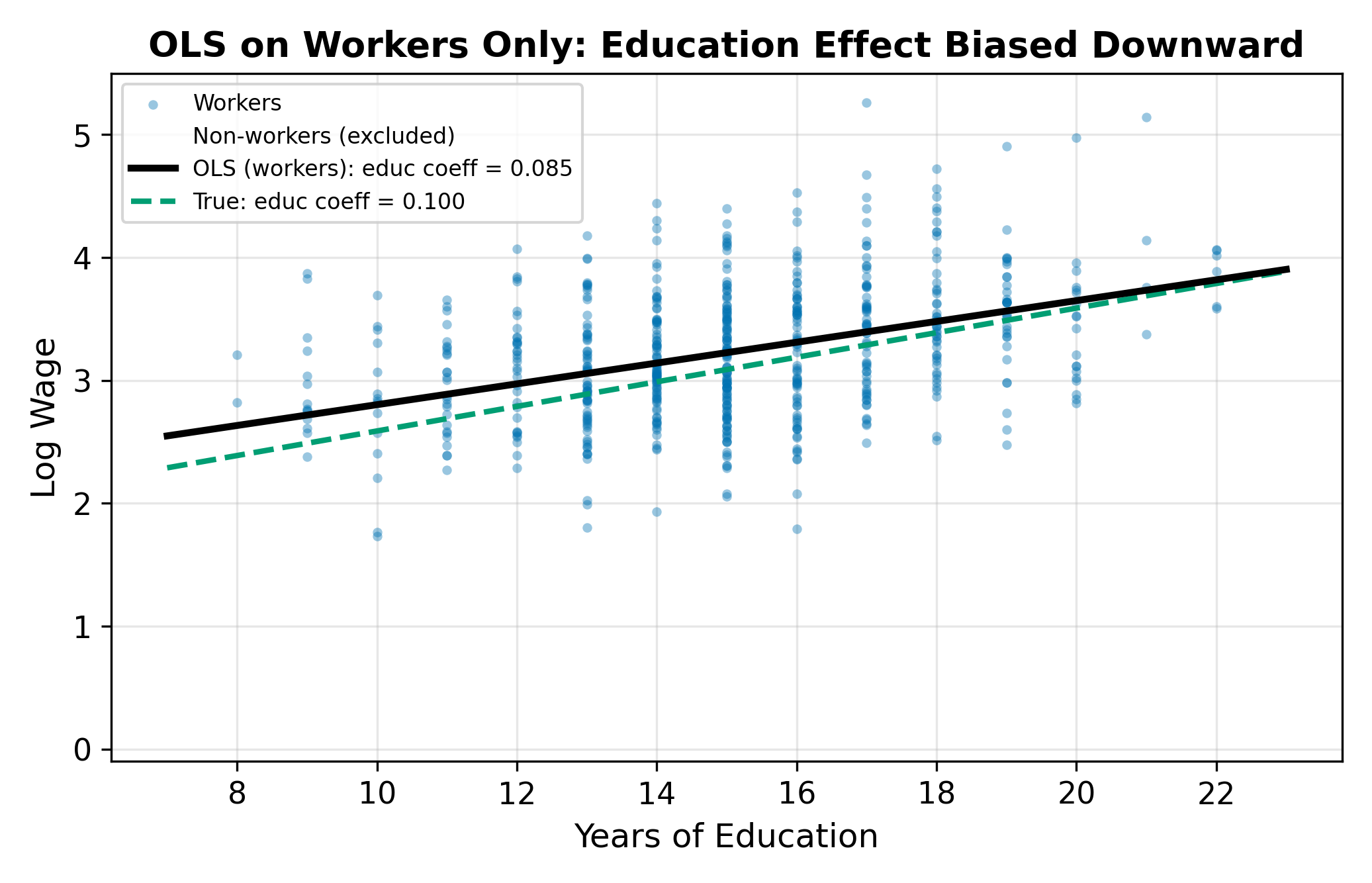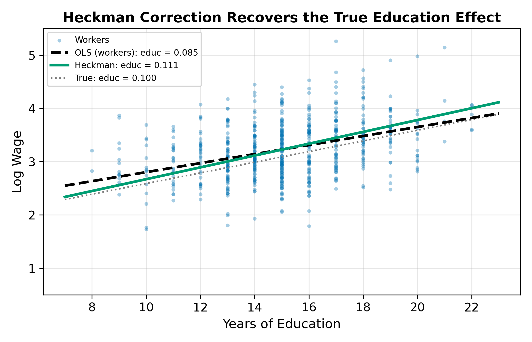 In the mroz wage data (a classic dataset in labor economics), the Heckman two-step typically yields \(\hat{\delta} > 0\), indicating positive selection. Women who participate in the labor force tend to have higher unobserved wage determinants than non-participants. Naive OLS on working women overestimates wages at each education level because the sample is drawn from the upper tail of the unobserved ability distribution.