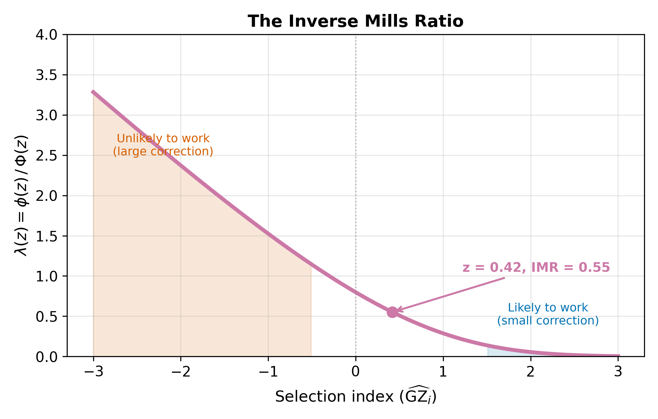 - Person A has characteristics that make working almost certain (\(\gamma' Z\) large, \(\Phi(\gamma' Z) \approx 1\)). The fact that A works tells us almost nothing about their unobserved wage determinants. Their \(\lambda\) is small.