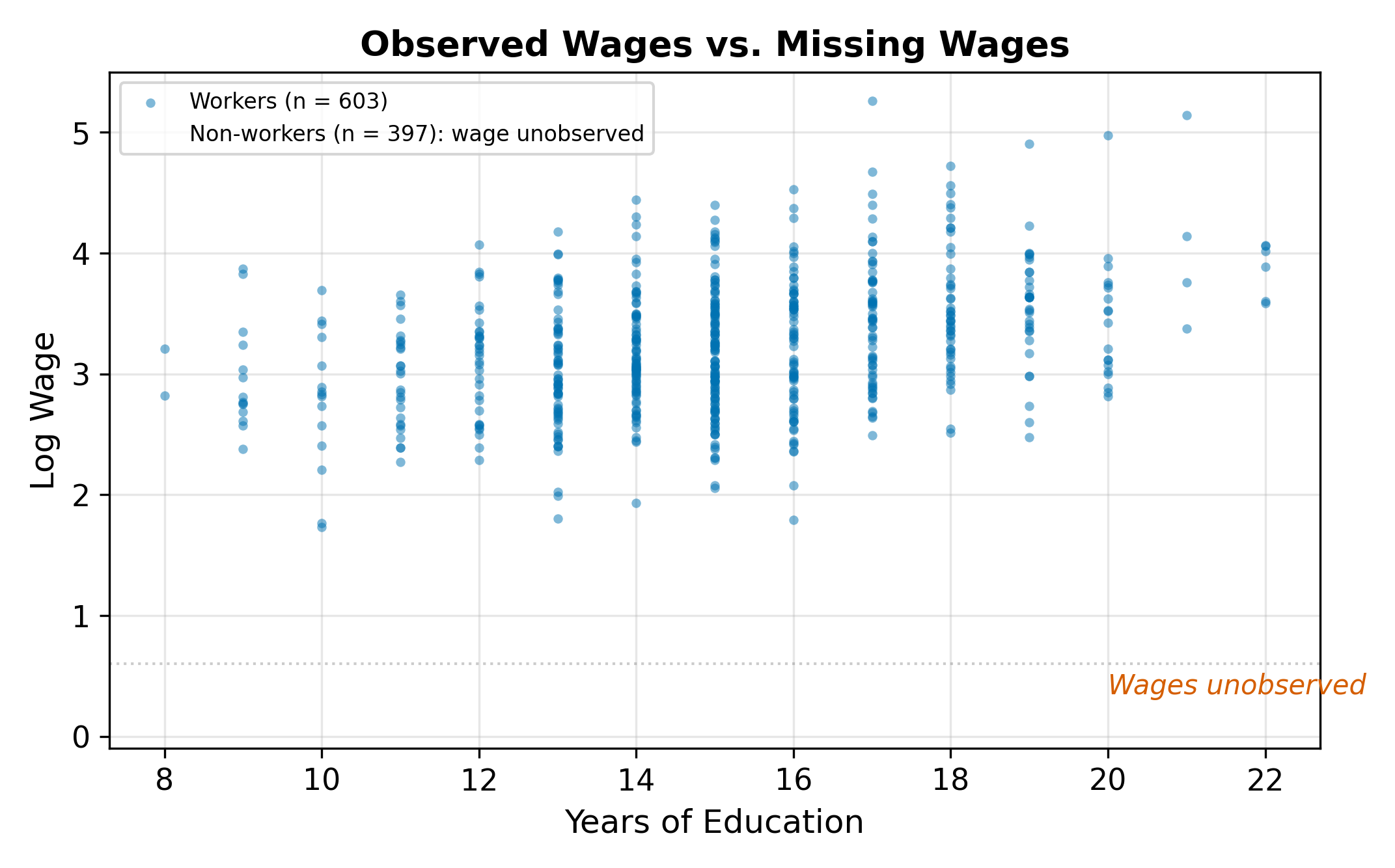 We want to estimate the return to education (\(\beta_1\)) and the return to experience (\(\beta_2\)). But we only observe wages for people who work. Non-workers have no wage data. Their \(y\) is missing.