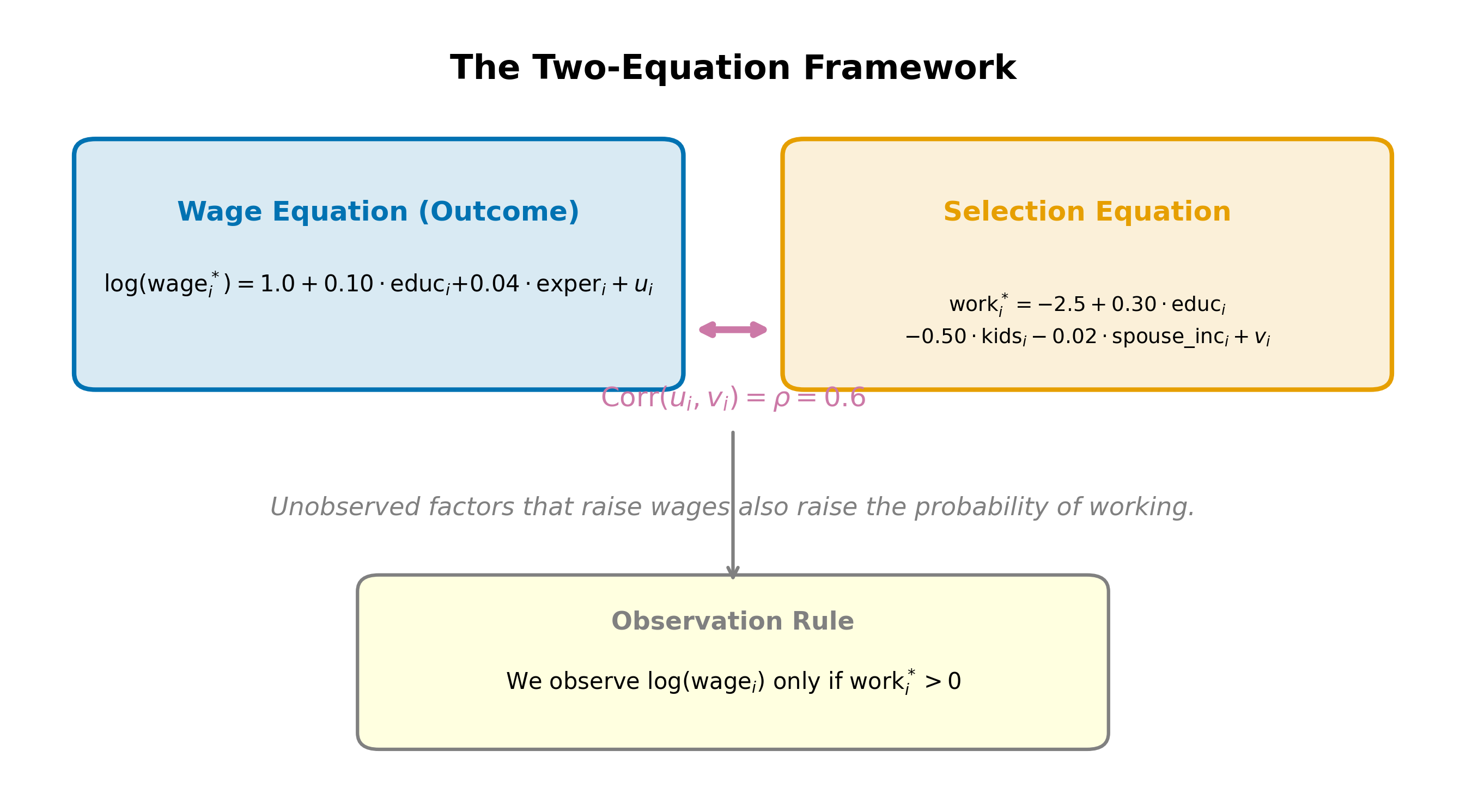 The variance of \(v_i\) is normalized to 1 (as in any probit). The parameter \(\rho\) is the correlation between the two errors. If \(\rho \neq 0\), the unobserved factors driving the work decision are correlated with the unobserved factors driving wages. This is the source of the selection bias.