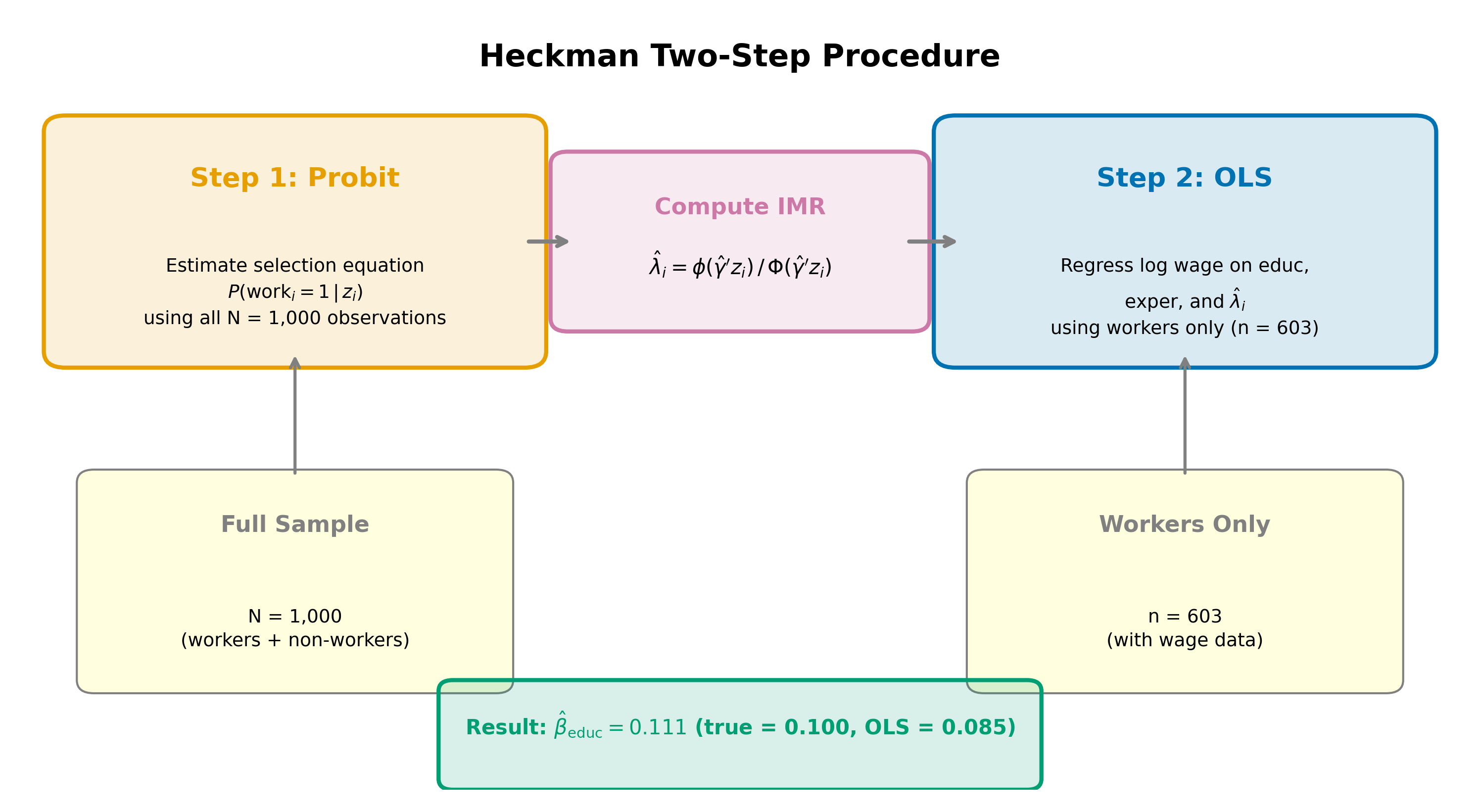 We observe wages only for workers. If the decision to work is correlated with unobserved determinants of wages (e.g., motivation), OLS on workers only is biased. Heckman’s two-step procedure models the selection process with a probit, constructs the inverse Mills ratio as a sufficient statistic for selection bias, and includes it as an additional regressor in the wage equation.