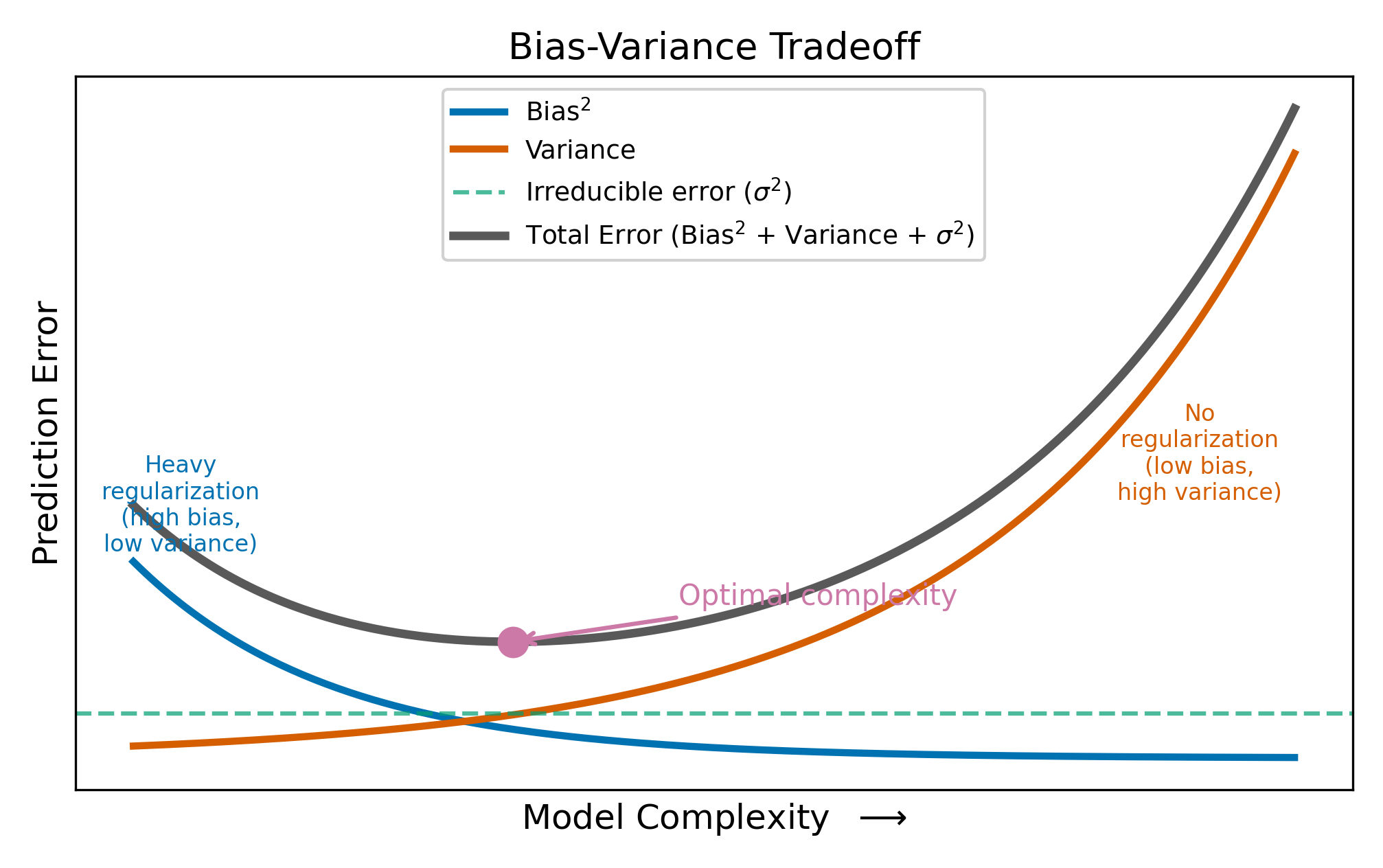 where \(\sigma^2\) is the irreducible noise in the outcome. You cannot do anything about \(\sigma^2\). The question is how to balance the other two terms.