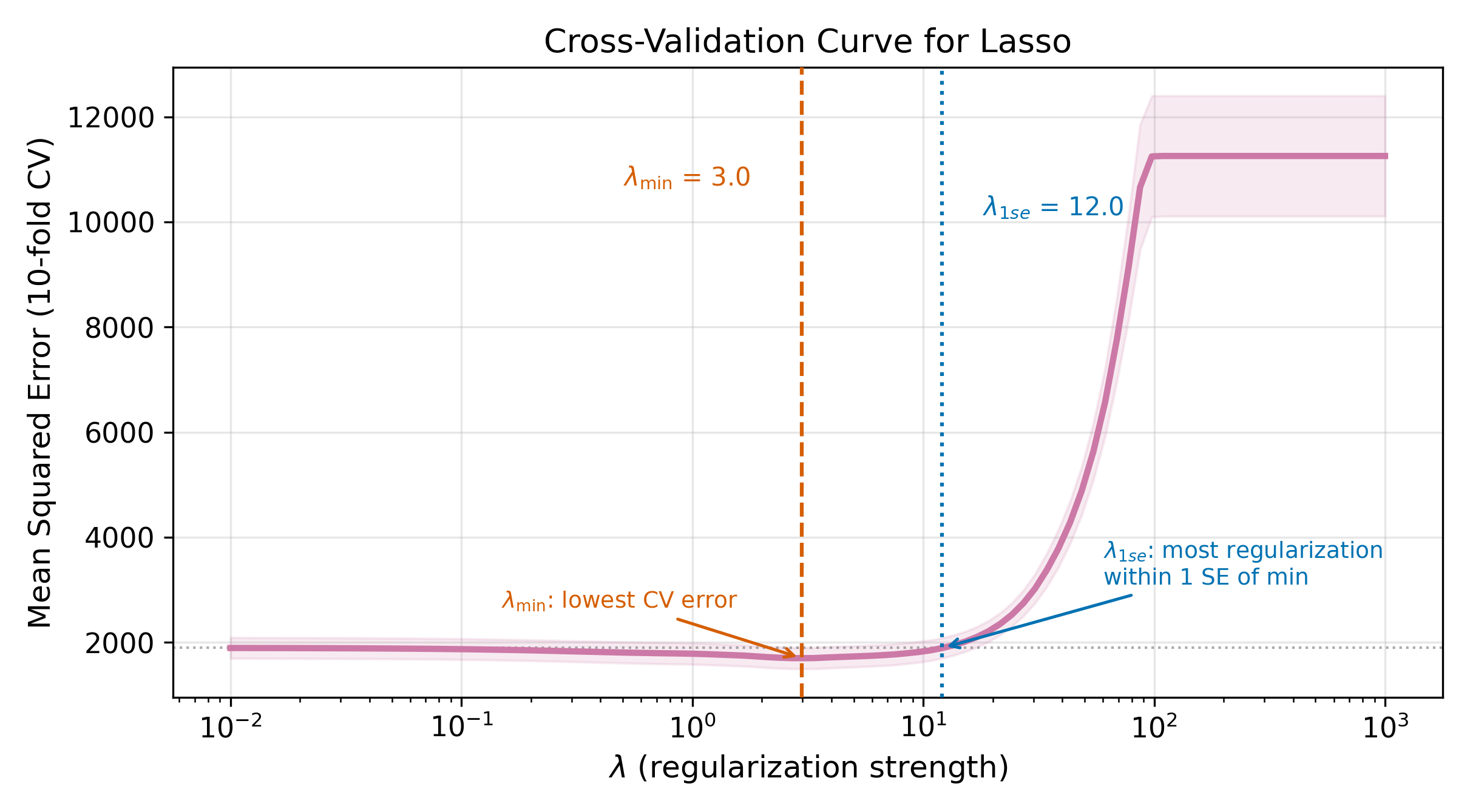 The CV error curve is typically U-shaped (on a log scale for \(\lambda\)). Let \(\lambda_{\min}\) denote the value that minimizes CV error. The one-standard-error rule recommends a more parsimonious choice: pick the largest \(\lambda\) whose CV error is within one standard error of the minimum. This is \(\lambda_{1\text{se}}\).