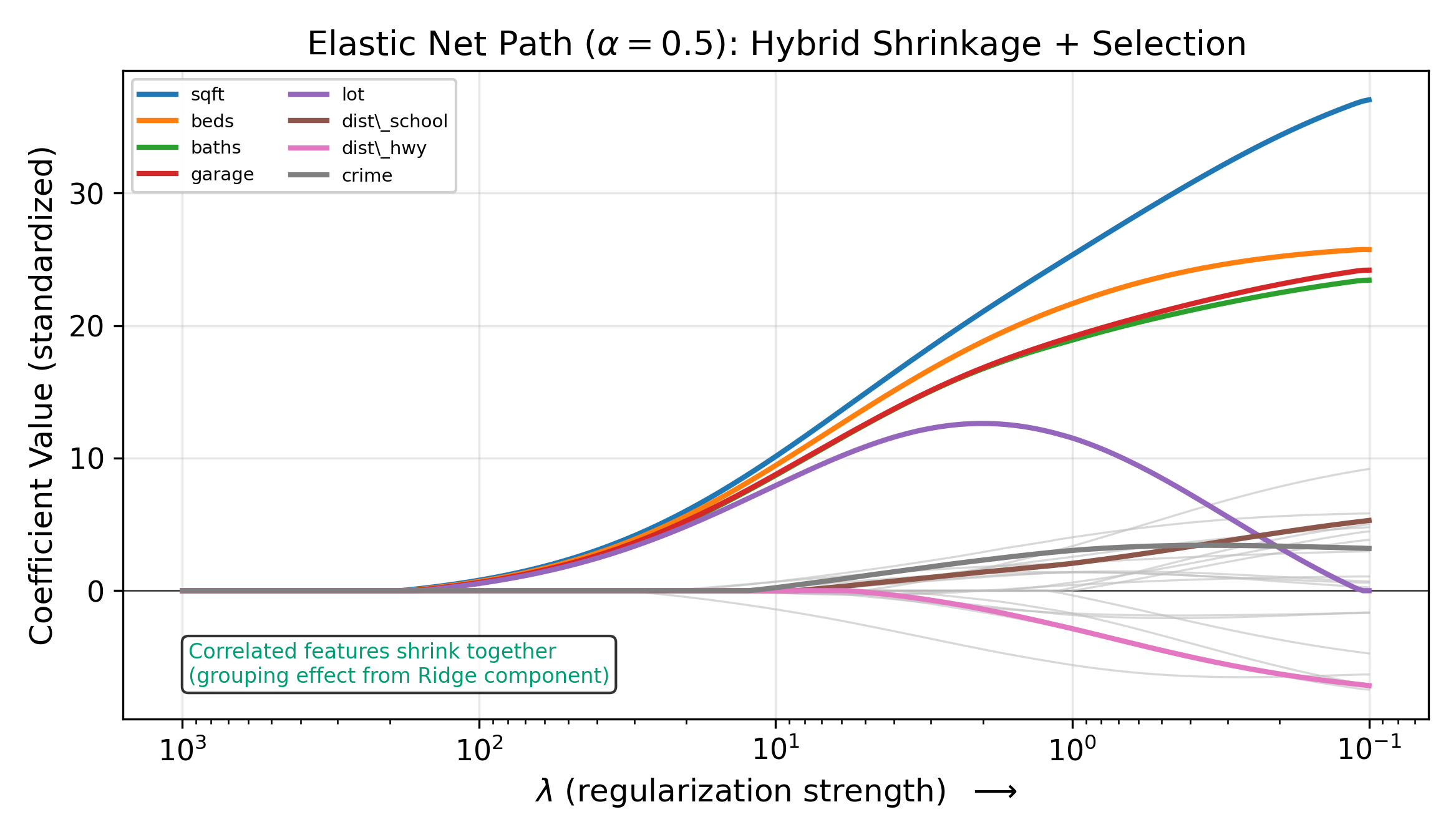 The Elastic Net’s Ridge component encourages correlated features to have similar coefficients rather than forcing a winner-take-all selection. The result is grouped selection: correlated features enter or leave the model together.