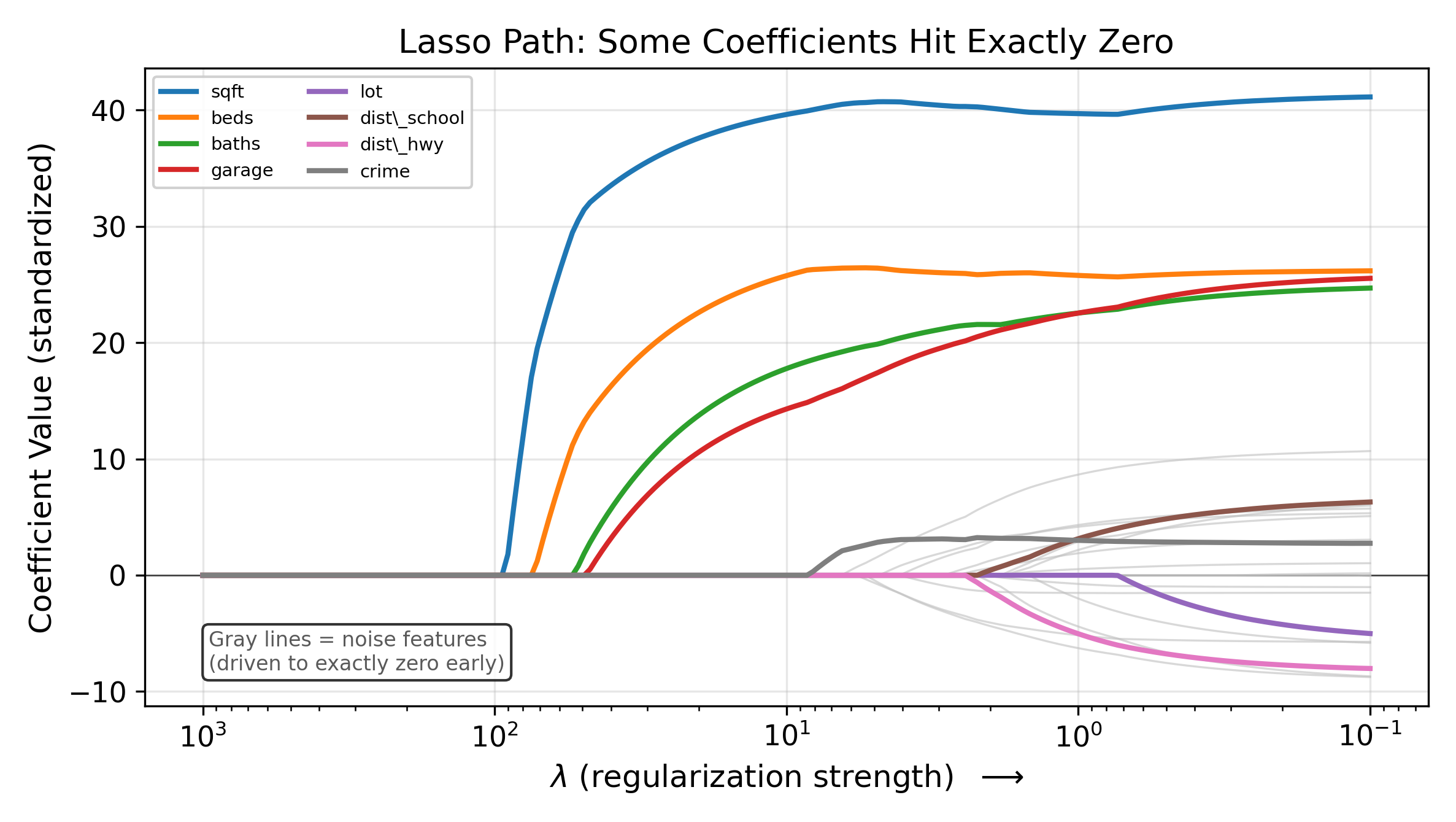 This looks like a minor change, but it has a dramatic consequence: the Lasso sets some coefficients to exactly zero. Unlike Ridge, which keeps all features in the model at reduced magnitude, the Lasso eliminates features entirely. The surviving features form a sparse model that is often easier to interpret.