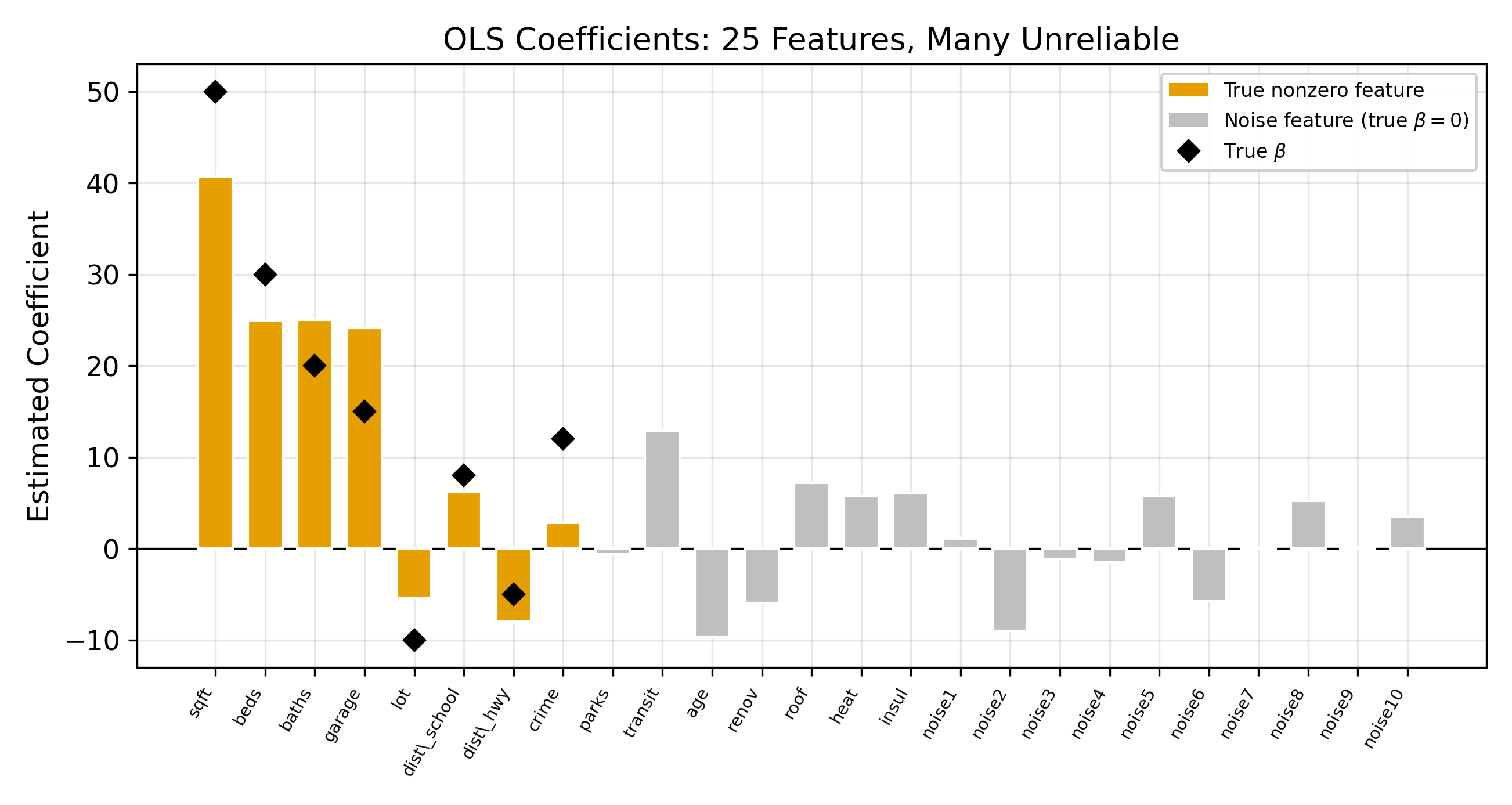 Suppose you have 25 candidate features and 200 observations. OLS will happily estimate all 25 coefficients. It will find the linear combination that fits the training data as closely as possible. The problem is that some of that fit comes from noise.