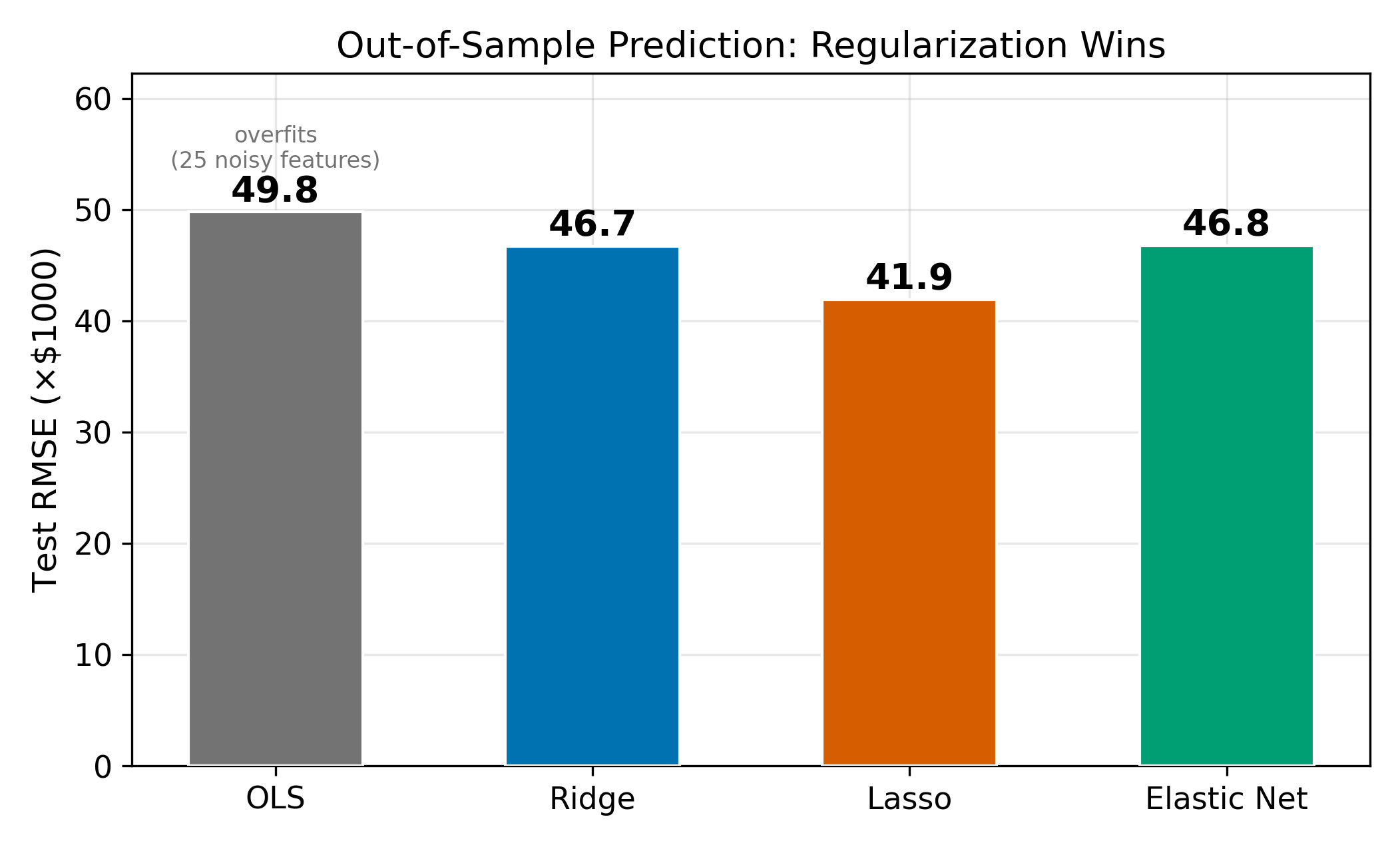 How do these methods perform head-to-head? On a typical dataset with a mix of signal and noise features, OLS overfits, Ridge and Lasso improve substantially, and Elastic Net often matches or slightly beats both.