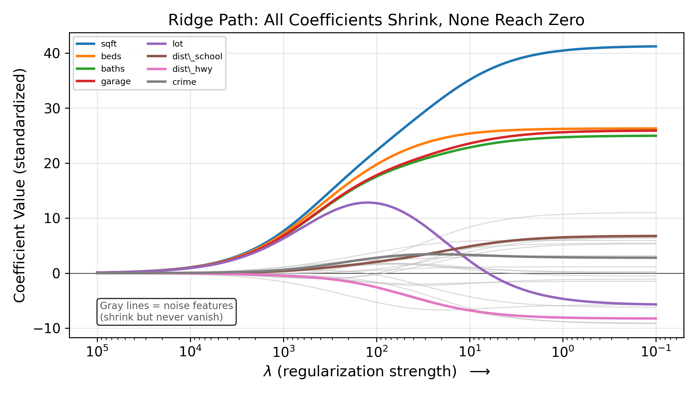 The ratio \(\sum x_i^2 / (\sum x_i^2 + \lambda)\) is always between 0 and 1. When \(\lambda\) is small relative to \(\sum x_i^2\), the ratio is close to 1 and Ridge barely changes the OLS estimate. When \(\lambda\) is large, the ratio approaches 0 and the coefficient is pulled close to zero. This proportional shrinkage applies to every coefficient in the model.