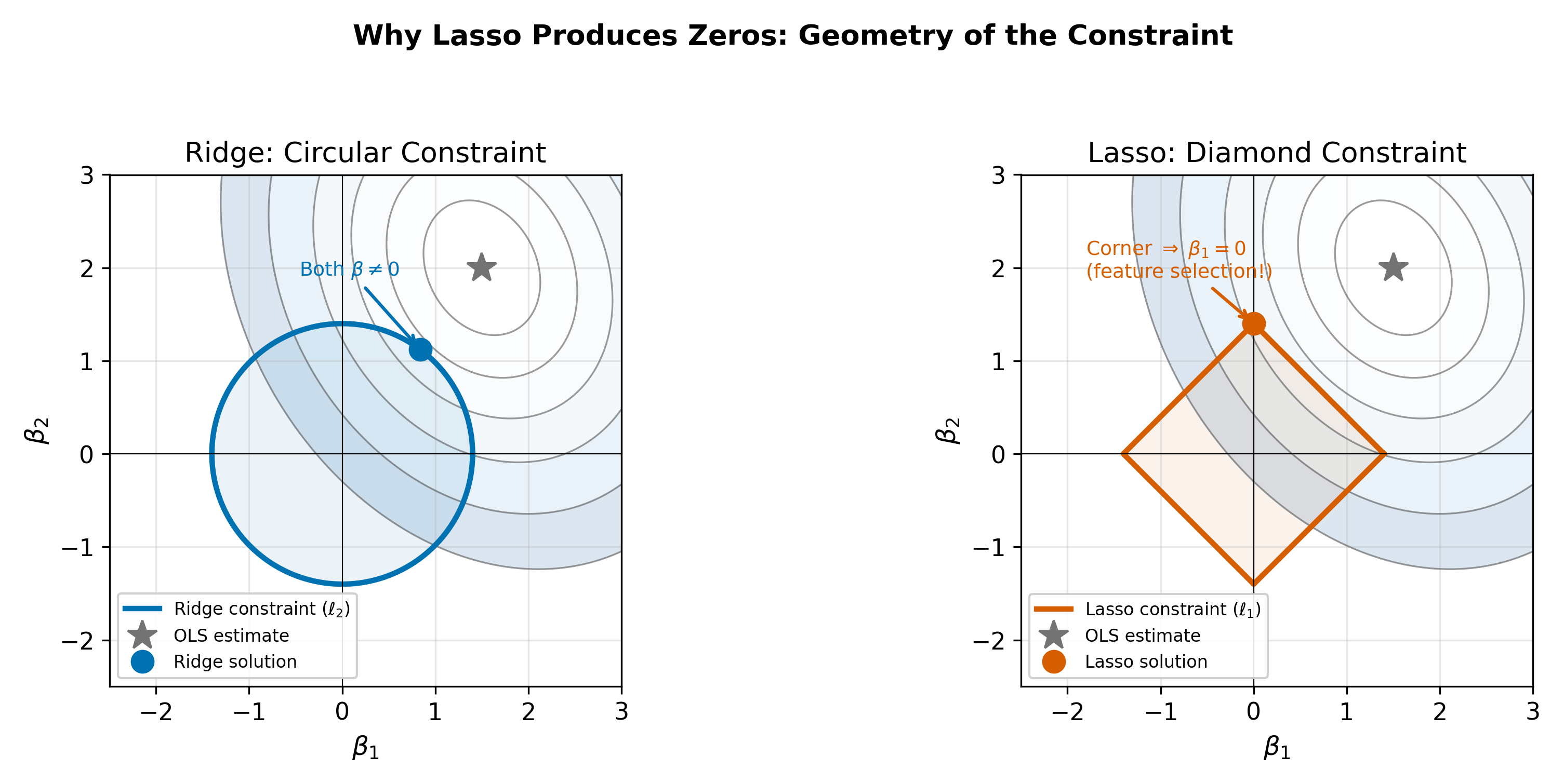 The corners of the diamond lie exactly on the coordinate axes, where one or more coefficients equal zero. Elliptical contours approaching a smooth, curved boundary (the circle) will generically make tangential contact at a point where both coordinates are nonzero. But a diamond has flat edges that meet at sharp corners. The ellipse is more likely to first touch the diamond at one of these corners than along a flat edge, because the corner juts out toward the approaching contour. At a corner, at least one coordinate is zero. This geometric argument generalizes to higher dimensions, where the \(\ell_1\) ball has even more corners relative to its faces.