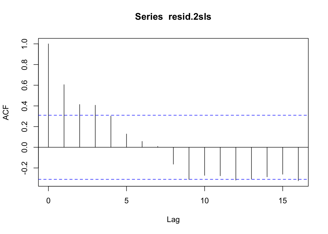 From the BG test of 2 lags, we have an \(N \times R^{2}\) test statistic of 17.732842. This is much greater than the critical value of 5.991465. Thus, we reject the null hypothesis of no serial correlation.