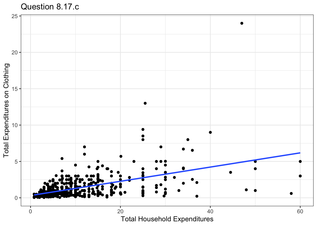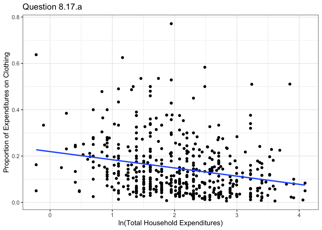 ylab("Proportion of Expenditures on Clothing")+theme_bw()+ggtitle("Question 8.17.a")model17a <- lm(data=malawi, pclothes~lntotexp)