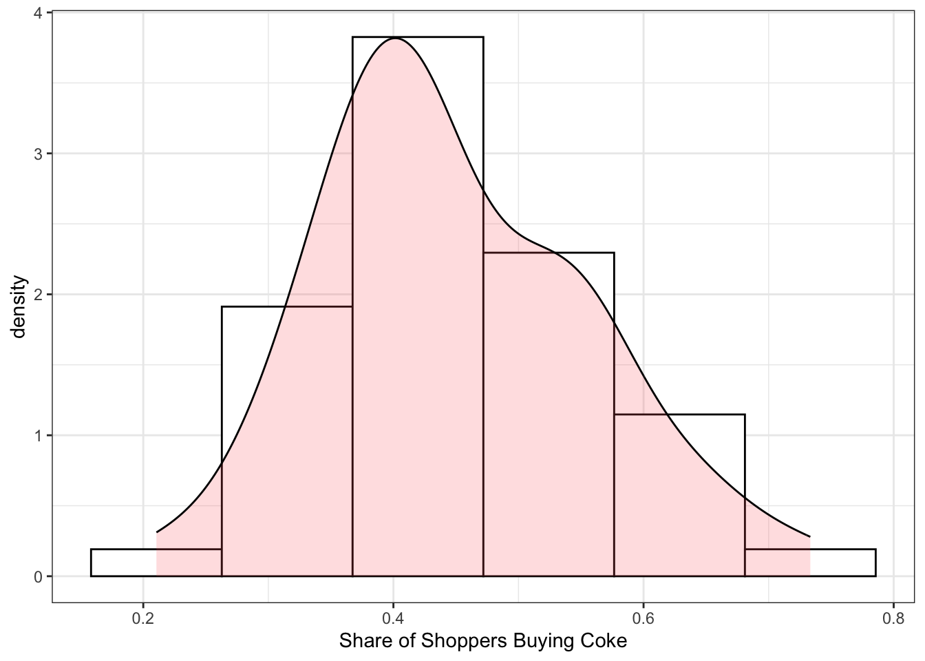 geom_density(alpha=.2, fill="#FF6666") +xlab("Share of Shoppers Buying Coke") + theme_bw()Find least squares estimates of equation above and use robust standard errors. Summarize the results. Test the null hypothesis \(\beta_3 = -\beta_4\). Choose an appropriate alternative hypothesis and use the 5% level of significance. If the null hypothesis is true, what does it imply about the effect of store displays for COKE and PEPSI?