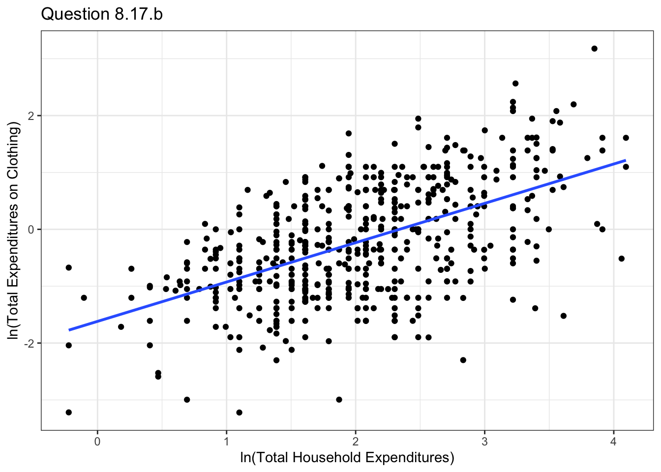 malawi <- malawi_small[malawi_small$pclothes>0,]Plot PCLOTHES versus ln(TOTEXP) and include the least squares fitted line. Calculate the point elasticity of clothing expenditures with respect to total expenditures at the means. See Exercise 4.12 for the elasticity in this model.1
